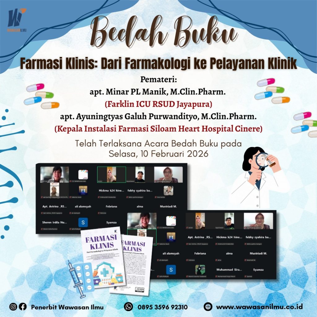 Penerbit Wawasan Ilmu mengucapkan terima kasih kepada Penulis, Moderator dan Peserta Bedah Buku “Farmasi Klinis: Dari Farmakologi ke Pelayanan Klinik” pada tanggal 10 Februari 2026, atas partisipasinya. Semoga bermanfaat dan dapat menjadi motivasi bagi para peserta untuk menulis buku.
