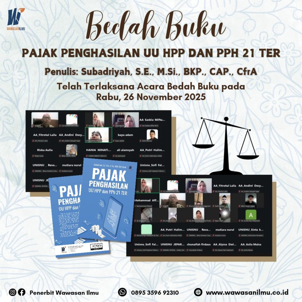 Penerbit Wawasan Ilmu mengucapkan terima kasih kepada Penulis, Moderator dan Peserta Bedah Buku “PAJAK PENGHASILAN UU HPP dan PPh 21 TER” pada tanggal 26 November 2025, atas partisipasinya. Semoga bermanfaat dan dapat menjadi motivasi bagi para peserta untuk menulis buku.
