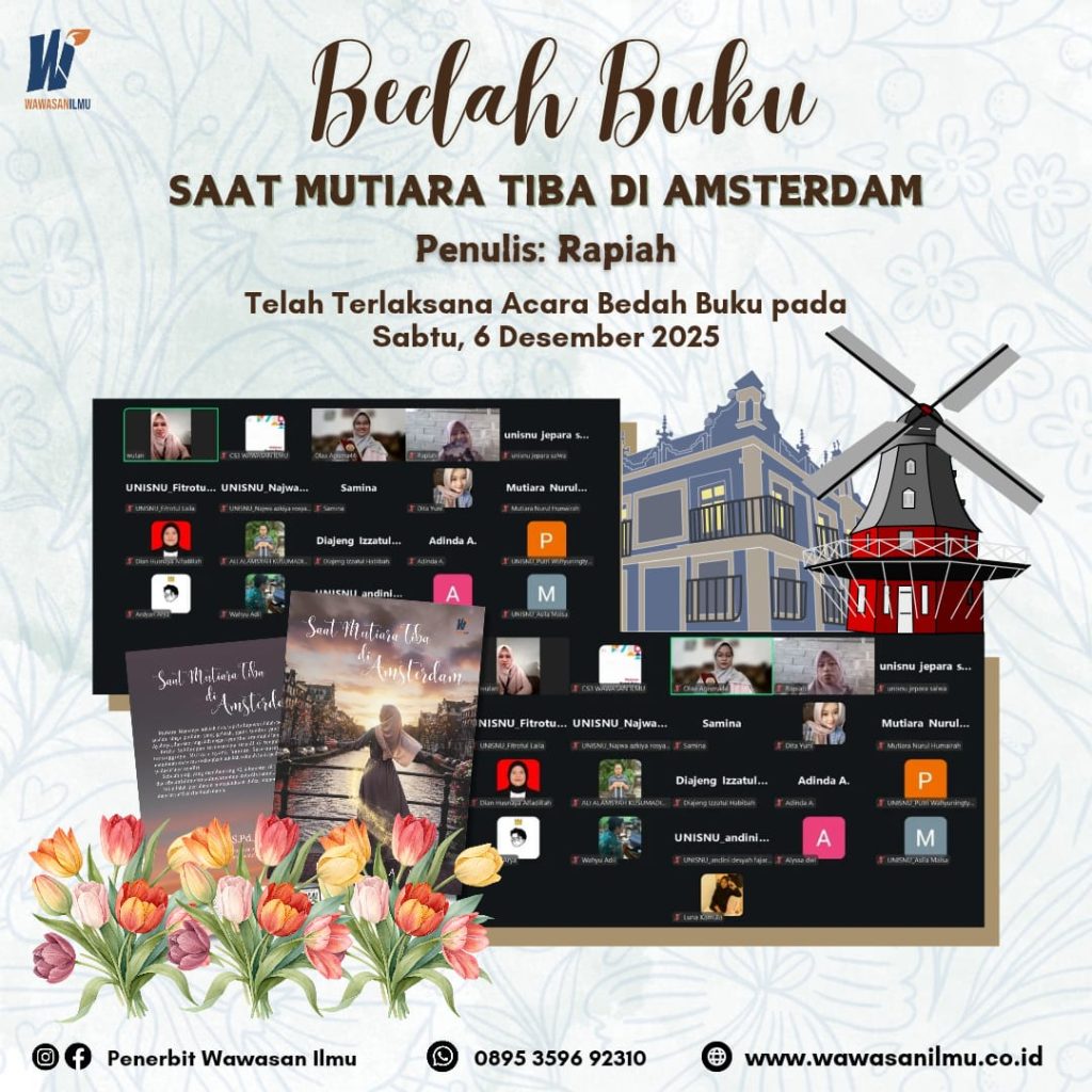 Penerbit Wawasan Ilmu mengucapkan terima kasih kepada Penulis, Moderator dan Peserta Bedah Buku “Saat Mutiara Tiba di Amesterdam” pada tanggal 6 Desember 2025, atas partisipasinya. Semoga bermanfaat dan dapat menjadi motivasi bagi para peserta untuk menulis buku.
